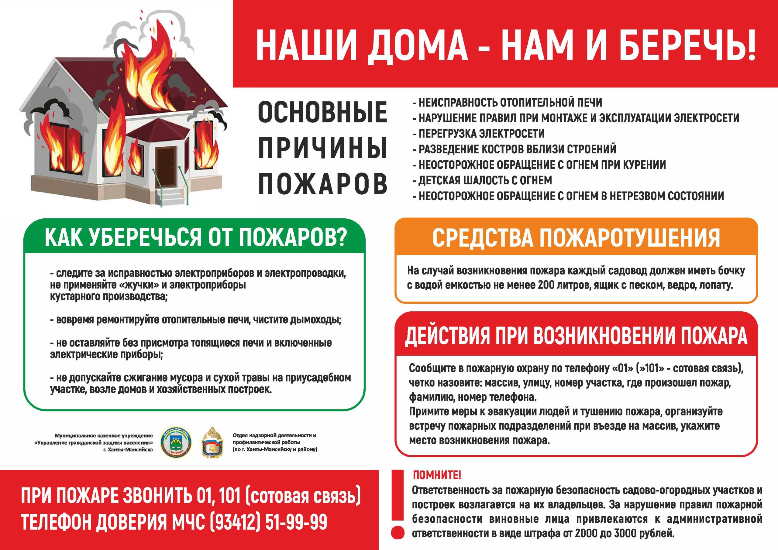 Пожар — это всегда не предсказуемо и если по какой-либо причине пожар произошёл в доме, садовом доме и подобных строениях, немедленно покиньте помещение, а также выведите на улицу детей и лиц, не способных самостоятельно передвигаться. Затем сообщите в пожарную охрану по телефону «01», «112».