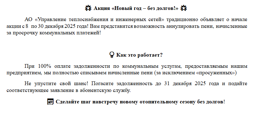 АО «Управление теплоснабжения и инженерных сетей» объявляет о проведении акции с 16 по 28 декабря 2024 года. Теперь у Вас есть возможность аннулировать пени, начисленные за просрочку платежей!