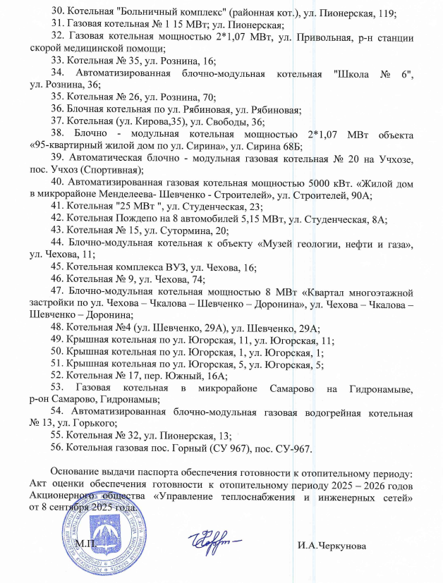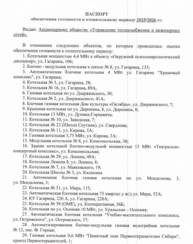 АО «Управление теплоснабжения и инженерных сетей» сообщает, что во исполнение Постановления Администрации города Ханты-Мансийска Ханты-Мансийского автономного округа Югры №162 «Об отопительном периоде 2025-2026 годов» от 03.04.2025г, централизованное теплоснабжение в полном объеме подано:
